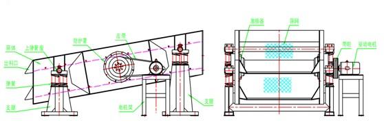 該系列篩機為座式安裝。篩面傾角的調整可通過改變彈簧支座位置高度來實現(xiàn)。